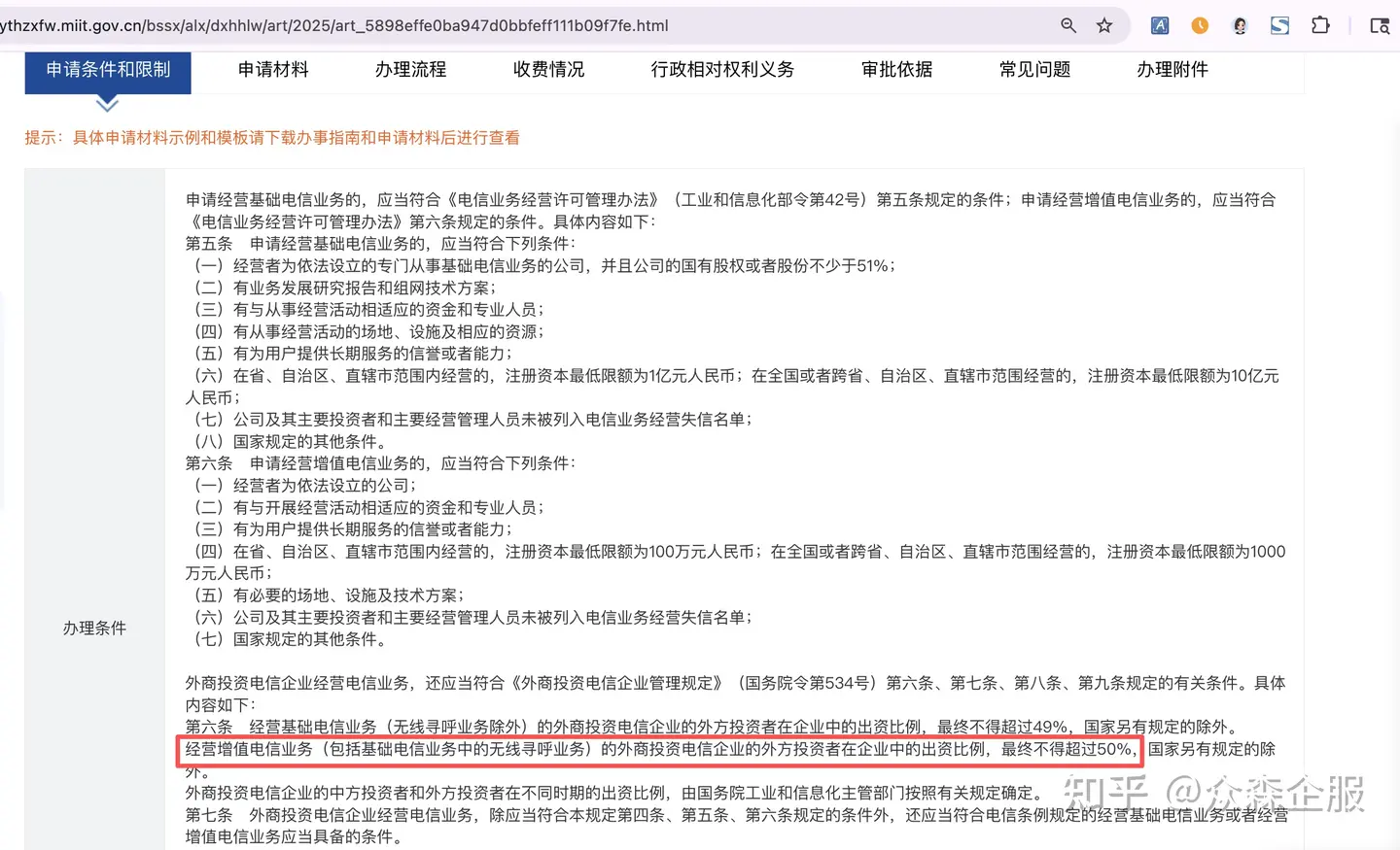 想办证,先得知道政策和底线。目前外资申请增值电信业务(ICP许可证、EDI许可证),核心依据是《外商投资电信企业管理规定》和2024年10月启动的“增值电信业务扩大对外开放试点政策”,关键规则分两种情况: